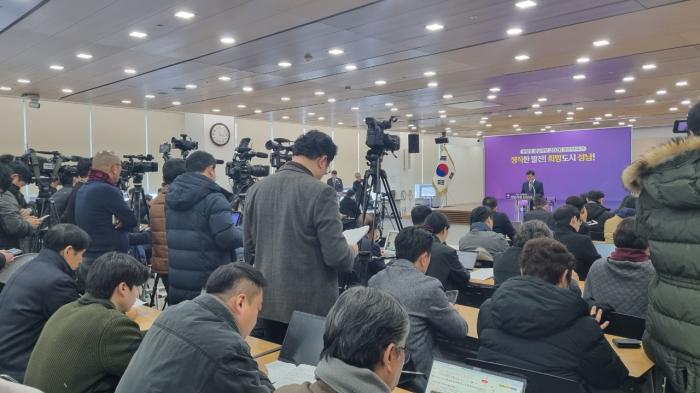 ▲2026성남시 신년기자회견장 100여명 기자들이 취재하는모습