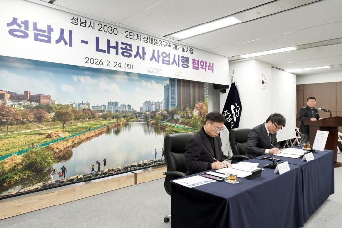 성남시(시장 신상진)는 24일 오전 9시30분 한국토지주택공사(LH)와 성남 상대원3구역 재개발사업에 대한 사업시행협약을 체결했다.