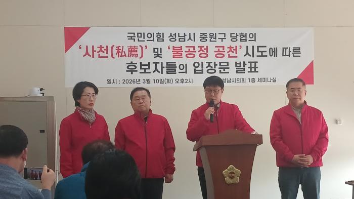 국민의힘 성남시 중원구 6·3 지방선거 출마예정 후보자 5인(김동민·김두일·김정희·허준·허지은)은 10일 성남시의회 1층 세미나실에서 성명서를 내고 ‘비민주적 위원장으로 인해 무너진 공정과 정의를 바로 세워달라’고 호소했다.